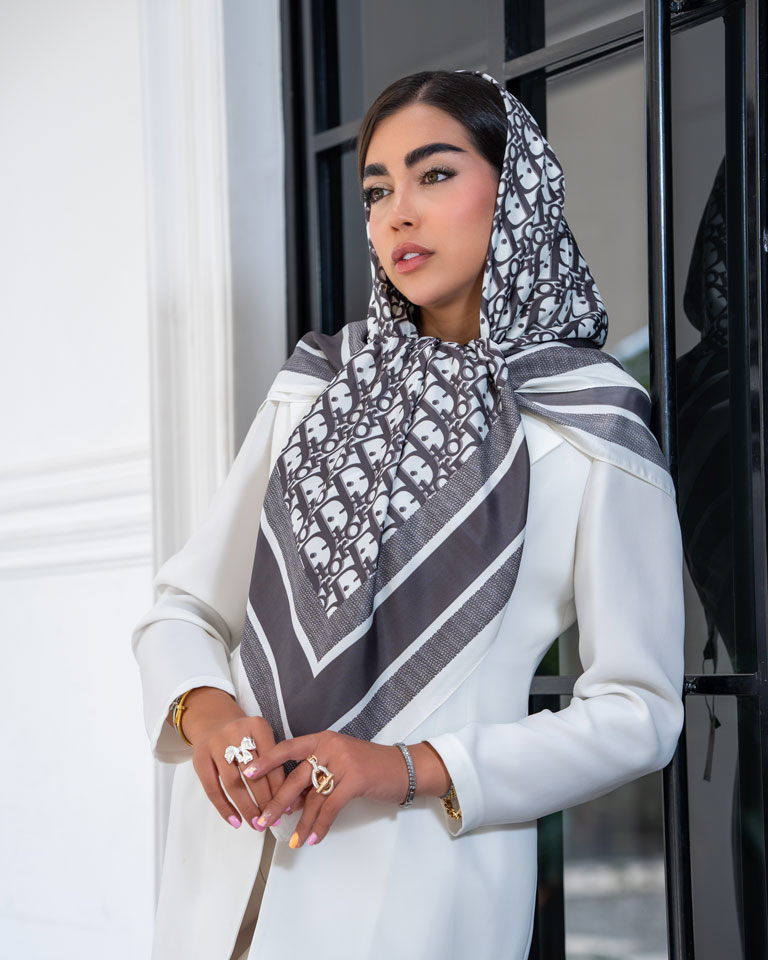 زمینهی سفید، حس لطافت و پاکی را منتقل میکند و چاپ مشکی مونوگرام برند، جلوهای لوکس و جسورانه به آن میدهد. این تضاد باعث میشود روسری در هر نوری بدرخشد و با هر رنگ لباسی ست شود.