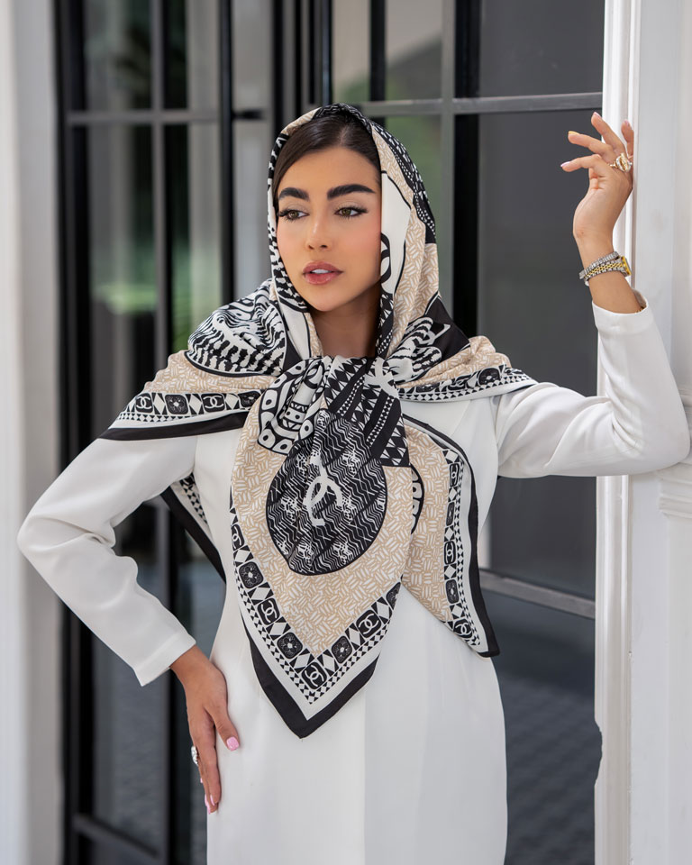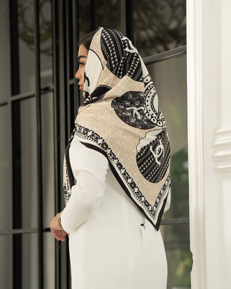 روسری ابریشم کرم مشکی شنل کد ۳ نماد زیبایی کلاسیک و کیفیت اصیل است.