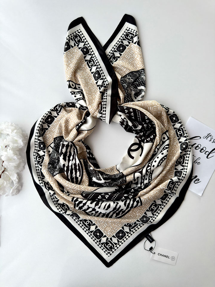 برند Chanel همیشه در خط مقدم طراحیهای ظریف و مینیمال بوده است. این روسری نیز با همان فلسفهی «کم اما چشمگیر» ساخته شده. طرح مونوگرام شنل، با بافتی لطیف و چاپی دقیق روی پارچهی ابریشم توییل، جلوهای خاص به استایل شما میدهد.